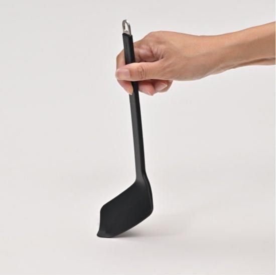 從握柄到鏟面一體成型,沒有多餘縫隙,外層覆蓋黑色矽膠,讓食材屑屑不易堆積、也能盡量避免染色狀況,同時也能保護鍋具不被刮傷。